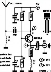 This inexpensive VHF preamplifier uses the BF324 TO92 style pnp transistor in a grounded-base configuration. The circuit may be used as a signal booster with VHF receivers whose front end suffers from low sensitivity (such as many valved and army surplus types). The frequency range of the preamplifier is roughly from 75MHz to 150MHz. The two inductors in the circuit are home made. L1 consists of 10turns of 24SWG enamelled copper wire; the internal diameter is 3mm, no core. Inductor L2 has 13 turns of the same wire, and an internal diameter of 5mm; no core is used either. A construction tip: close-wind the inductors using 3 and 5mm drill bits respectively as temporary formers.