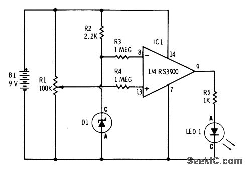 One section of RS3900 quad opamp is connected as comparator using zener D1 for reference voltage. When voltage applied to pin 13 by R1 exceeds breakdown voltage of zener D1, comparator amplifies difference voltage to produce output voltage high enough to turn on LED. Can be used for classroom demonstration of comparator action.Zener breakdown should be under 9 V. LED can be Radio Shack 276-041.—F. M. Mims, Semiconductor Projects, Vol. 2, Radio Shack, Fort Worth, TX, 1976, p 35-42.