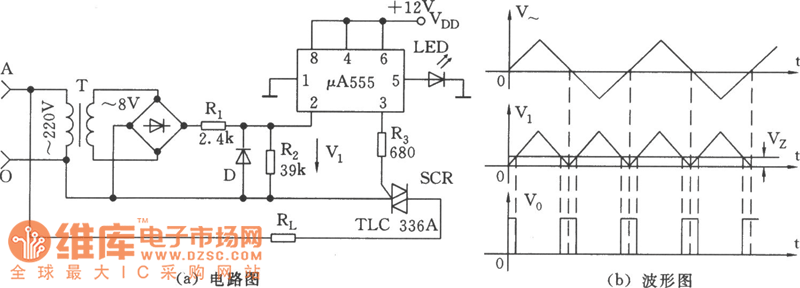 As shown in the figure, the zero volt switch circuit will produce trigger impulse when ac voltage passes zero. In order to achieve it, 555 is connected in the form of a comparator, and corresponding static offset voltage 0.7 ~ 1 V is set on the controlling end feet 5 .A LED is used as comparing device , as well as indication of the existence of the reference voltage . The oscillogram of working process is as shown in figure (b). Here, to illustrate the problem, sine wave is drawn as triangle wave, but analysis of the process will not be influenced.