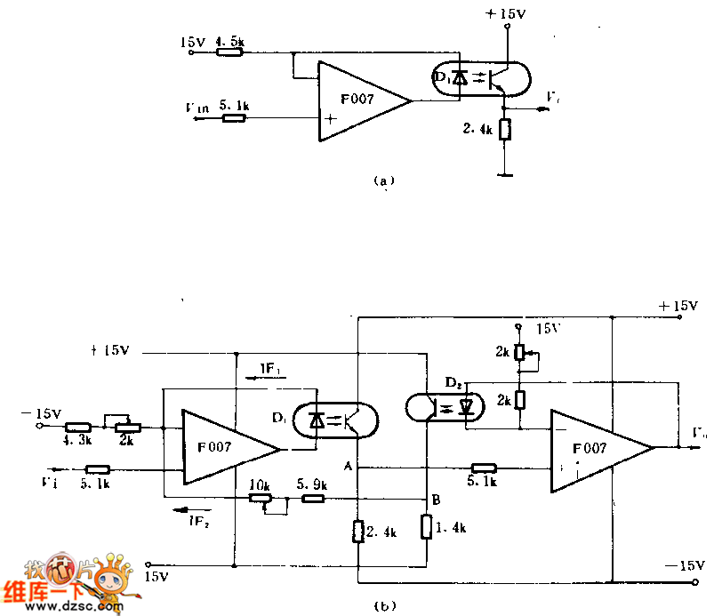 We can improve the linearity of transmission of photoelectric couplers markedly by using inverse feedback.In the picture a,D1 is in the feedback path,the current through D1 will vary linearly with V1 strictly.The shortage of this circuit is that it don't consider the non-linear relation between current transmission of photoelectric couplers and operating current.Thus,careful selection is necessary as well as adjusting device.In the picture b,the circuit adds the second order feedback in order to improve the linearity.The gain frequency of the circuit is between 0~30KHZ,and the dynamic range is -8~+8V,nonlinear distortion(when it is ±8V)is less than 0.5%,weeping sound is less than 1mV,common mode voltage is more than 250V.