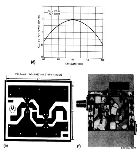 The electrical characteristics for the 2N5944 and 2N5946 shown in this circuit are given in Fig. 2-33B. Figures 2-33C and 2-33D show the amplifier performance over the frequency range. Figures 2-33E and 2-33F show the PC-board photomaster, and parts placement, respectively. Those not familiar with microstrip techniques (for Z1, Z2, and Z3) should read the many Motorola Publications, such as AN548A and AN555. (View)