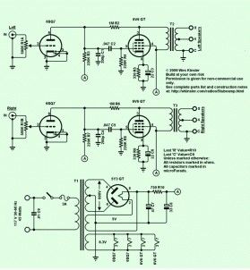Here the schematic diagram of 2x4W stereo tube amplifier which built based 5 power tubes component. This amplifier will produces up to 4 watt audio power for each output channel.   (View)