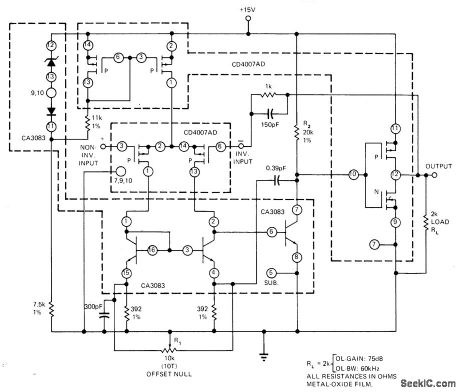 Combination of two 4007 CMOS gate packages andone CA3083 transistor package provides gain of about 75 dB as voltage-follower amplifier and bandwidth of 50 kHz. Slew rate is about 30V/μs, and settling time is 2 ps. Requires only single +15 V supply. Can be driven to within 1 mV of ground. Interfaces well with singlsupply D/A converters.-B. Furlow, CMOS Gates in Linear Applications: The Results Are Surpris-ingly Good, EDN Magazine, March 5, 1973, p 42-48. (View)
