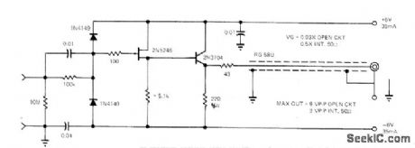 Overcomes problem that develops with trailing edges of pulses when emitter-follower using NPN transistor is driving heavily capacitive load. Extra transistor is used to dump capacitor charge when emitter-follower stops conducting at trailing edge of input waveform. Pulse trailing edge thus tends to cut off a, and saturate lower transistor so it discharges capacitor. Circuit works equally well with pulses, square waves,and sine waves Transistors need not bematched Reverse polarity of supplies to usePNP transistors Useful for driving long coaxlines or logic from high-impedance source,without inversion,-H.L.Morgan,Emitter Follower's Fall Time Is Independent of Load、EDN Magazine Feb,5,1977,p 105 (View)