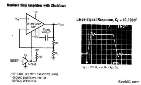 A constant or varying signal applied to the X input, Ec, controls the gain for a constant or vari-able signal applied to the Y input, Ein. The inputs could be interchanged.For this circuit, the set gain potentiometer is typically adjusted to provide a calibration for gain of Z 10 per-V-of-Ec. The bandwidth is dc to 30 kHz, independent of the gain. The wideband noise (10 Hz to 30 kHz) is 3 mV rms, typically, corresponding to full-scale signal-to-noise of 70 dB. Noise, referred to the signal input (Ec=±5V) is 60μV rms, typically. (View)