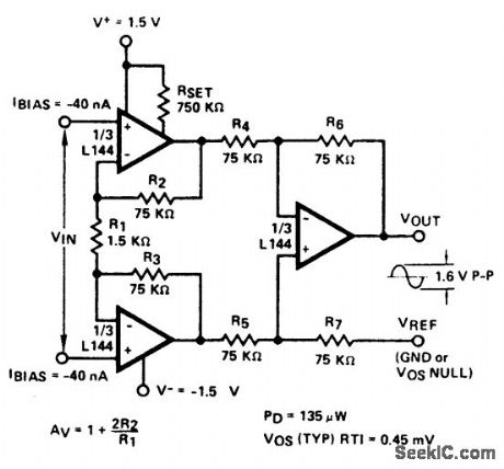 Three-amplifier circuit consumes only 135μW of power from a ±1.5 V power supply.With a gain of 101, the instrumentation amplifier is ideal in sensor interface and biomedical preamplifier applications. The first stage provides all of the gain while the second stage is used to provide common mode rejection and double-ended to single-ended conversion. (View)