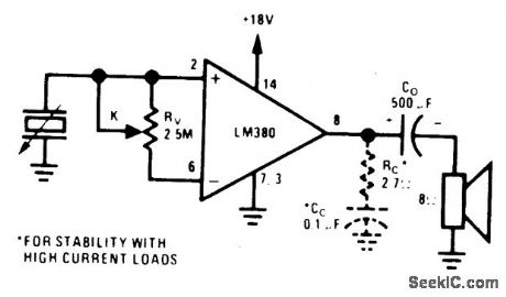 Not much can be said about how the LM382 works as most of the circuitry is contained within the IC. Most of the frequency-determining components are on the chip-only the capacitors are mounted externally. The LM382 has the convenient characteristic of rejecting ripple on the supply line by about 100 dB, thus greatly reducing the quality requirment for the power supply. (View)