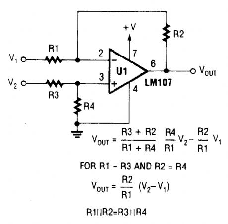 By using two inputs as shown, a difference amplifier yielding the differential between U1 and U2, times a gain factor results. (View)