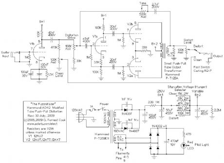 There are zillions of guitar distortion circuits on the Internet, many with funny names. The FuzzniKator is somewhat unique among the lot. The circuit was inspired by the great distortion sound that tube amps give a guitar during the seconds after the power has been shut off and the signal is fading out. The effect is also similar to a cranked tube amp driving a resistive speaker attenuator. The circuit uses a special starved push-pull tube output stage driving an output transformer which drives a resistive load. The push-pull output tubes are run from an adjustable (and lower than normal) B+ voltage in order to starve the tubes and produce distortion. The push-pull configuration and transformer output produce a more harmonically pleasant distortion compared to most diode-clipped distortion effects.