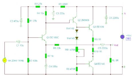 A 2 Watt audio amplifier made from discrete components. (View)