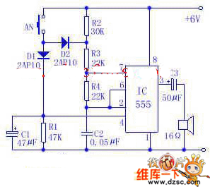 The following picture is a circuit of doorbell which can send out a sound like ding,dong .It is constituted of a time-base circuit integrated package and peripheral cells.The bell has a graceful and vivid tone,and it is easy and cheap to set up .A 6V laminated battery can be used over 3 months.Its electric power consumption is very low.The IC in the picture is time-base circuit integrated package 555 which forms astable multivibrator.Press the AN(which is set up on the door),the oscillator works, and the oscillating frequency is about 700Hz,and the speaker sends out ding .