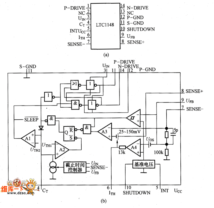 pin configuration and the internal equivalent circuit of LTC1148 are as shown in pictures. Pin ① (P-DRIVE) is connected to the grid of P-channel MOSFET,and when the output of this terminal is low, the high is the UI.When UI is lower than 8V,the external MOSFET sholuld use logic level threshold devices, and when UI is higher than 8V ,it should use the standard threshold devices.Pin ② (NC) is an empty pin, and it is connected to the power ground; Pin ③(UIN) is the power supply terminal.And 0.01 ~ 0.1μF ceramic bypass capacitor should be connected between pin ③ and pin @.