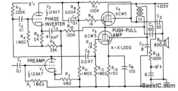 Feeds voice coil directly, making output transformer unnecessary. First preamplifying stage has positive feedback to point ofoscillation, while amplifier and output stages have negative feedback. Circuit haslow distortion, fiat response, and only a few degrees of phase shift over audio range.-J. Rodrigues De Miranda, Push. Pull Amplifiers Drive Speaker Directly,Electronics, 31:29, p 76-79.