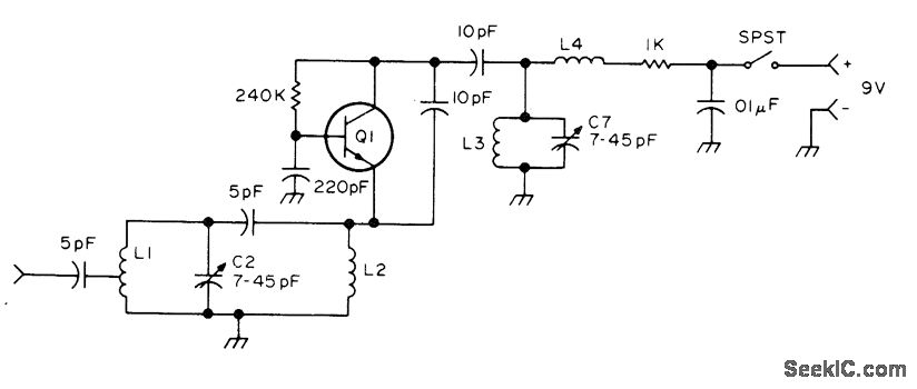 Values shown cover bands for aircraft radio, 2-m amateur radio band, and other services. Circuit is regenerative converter, with incoming signal tuned by La-C2 and mixed in 2N2222 or equivalent transistor connected as oscillator with frequency controlled by L3 and C7. Difference frequency is adjusted to fall in standard broadcast band, for pickup by radio when converter is mounted close to ferrite loop. For local stations, antenna of converter can be 19-in length of wire. L2 and L4 are 100-μH chokes or about 20 in of fine wire wound on 100K resistor. -S. Kelly, Simple VHF Monitor, 73 Magazine, July 1976, p160.