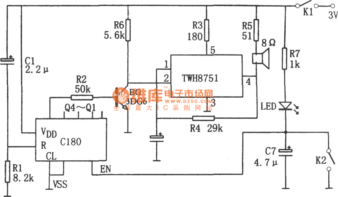 The count switch K2 composed of the a wire and the device body at the position of 135 film's holes, when the 135 film moves, each time the contact plate contacts the body, this circuit produces a count signal. When you open this device, the contact plate of first hole contacts the body, C180 has been reset. When the nineth hole of the photo comes, there will be 8 count signal, so the Q4 of C180 has high-level voltage to turn on the BG, pin-4 outputs the signal to drive the speaker to tell master the photo is in position.