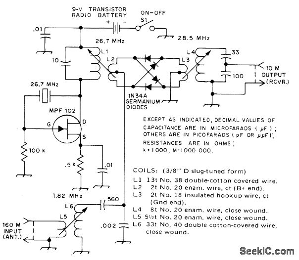 Simple converter adds 160-meter band capability to older CW or AM receiver. Passive mixer is adequate. High output frequency eliminates IF feedthrough and image signals. Crystal oscillates on third over-tone and feeds directly into mixer. -A. Bloom, A Simple 160-Meter Converter, QST, Feb. 1975, p46.