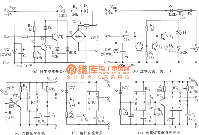 (a)Zero passed alternating current switch (1) (b)Zero passed alternating current switch (2) (c)Light-operated time-delayed switch (d)Street lamps automatic control switch (e)Corridor lamps energy saving automatic control switch