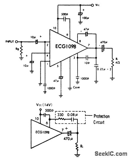 4-watt OTL power amplifier using 10-pin TO3. Typical supply voltage is 14 volts. The circuit is designed for a 4-ohm load and its efficiency is 60%. Typical voltage gain is 39 dB. Input impedance is 6.5K. Bandwidth is 70 hertz to 20 kilohertz. Although the ECG1098 can handle short-circuit conditions for short durations, it is recommended that the protection circuit shown be used if long periods with the speaker load shorted occur (courtesy GTE Sylvania Incorporated).