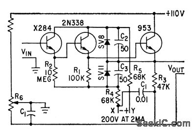 Bootstrap-collector circuit uses starved transistor to provide 500-meg d-c input resistance with 100-v input signal. A-c resistance is even higher, in the 1,000-megohm region at low audio frequencies.-B. M.Bramson, Starved Transistors Raise D-C Input Resistance, Electronics, 32:5, p 54-55.