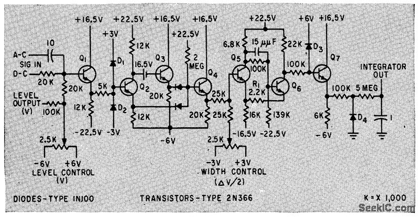Width of output pulse is proportional to time that input signal is between specified voltage levels. Used in statistical measurements of signals and noise.-B. M. Rosenheck, Detecting Signals By Polarity Coincidence, Electronics, 33:5, p 67-69.