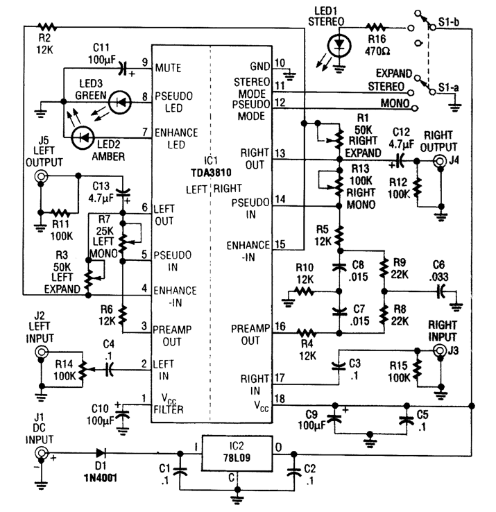 This audio processor is based on the Signetics/Philips TDA3810N stereo, spatial, pseudo-stereo processor, IC. This processor uses a Philips TDA3810IC device, and it functions as an expander, pseudo stereo processor, and audio enhancer. Pseudo stereo is obtained by routing various frequencies to each channel via active filters