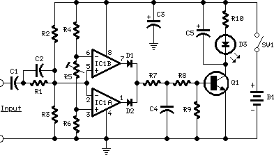 This Audio Clipping Indicator circuit was intended to detect clipping in preamp stages, mixers, amplifiers etc. and can be used as a separate, portable unit, to signal by means of a LED when the output wave form of a particular audio stage is “clipping” i.e. is reaching the onset of its maximum permitted peak-to-peak voltage value before an overload is occurring. This will help the operator in preventing severe, audible distortion to be generated through the audio equipment chain.This unit is particularly useful in signaling overload of the input stages in mixers, PA or musical instruments amplification chains, but is also suited to power amplifiers. A careful setting of Trimmer R5 will allow triggering of the LED with a wide range of peak-to-peak input voltages, in order to suit different requirements.