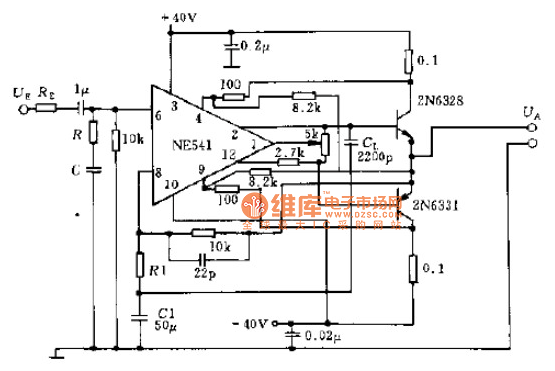 Diagram using NE541 high voltage power amplifier, current gain in 20 ~ HZ20KHZ frequency range is 90 db, at 300 mv RMS input, output high level RMS 20 v. integrated circuit internal equipped with short circuit protection. The external current limiting network to provide additional protection, two output transistor to increase the output power to 75 w, to drive the speakers.