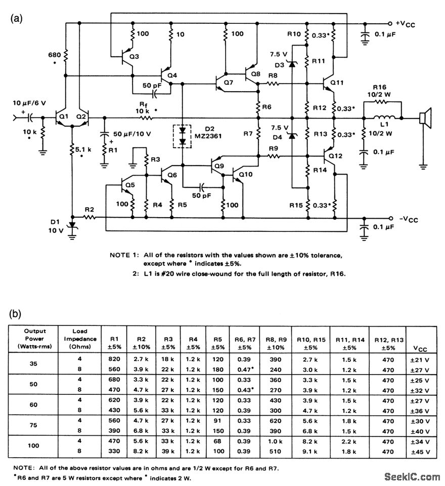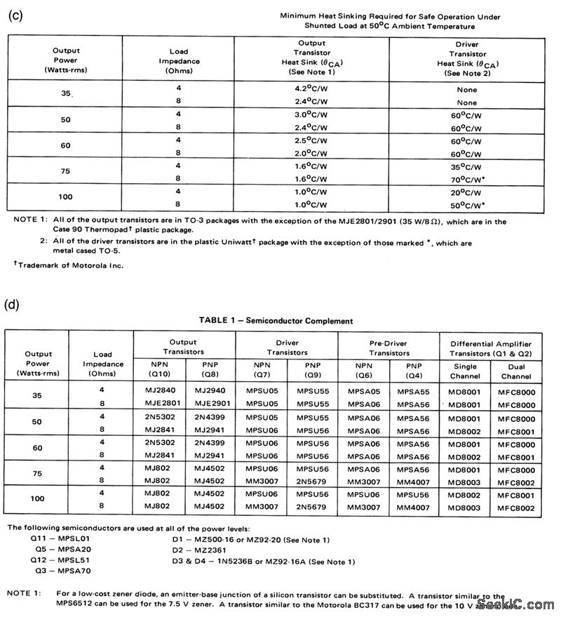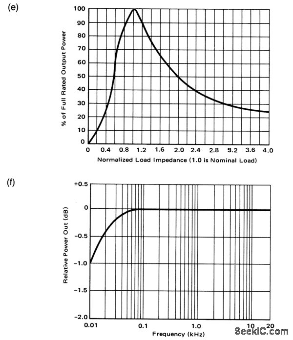 This circuit makes optimum use of economy transistors in discrete-component amplifiers that will operate safely under any usable load conditions, including shorts. Figures 1-15B, 1-15C, and 1-15D show the transistor complement, resistor values/power-supply voltages, and heatsink requirements, respectively, for various power outputs from 35 to 100 W. Input sensitivity is 1 Vrms into 10 kΩ for full-rated output power. Frequency response is less than 3-dB rolloff from 10 Hz to 100 kHz, referenced to t kHz. Power bandwidth is the full-rated output power ±2 dB from 20 Hz to 20 kHz. Figures 1- 15E and 1- 15F show the load sensitivity and power bandwidth. Total harmonic distortion (THD) is less than 0.2% at any power level between 100 mW and full-rated output and at any frequency between 20 Hz and 20 kHz. Inter modulation distortion is less than 0.2% at any power level from 100 mW to the full-rated output (60 Hz and 7 kHz mixed 4 to 1 )
