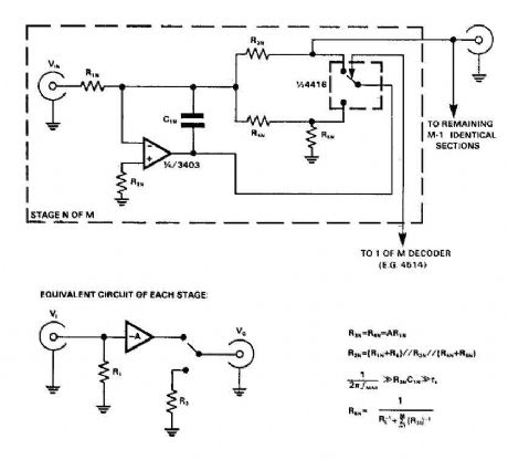 CMOS switches are used directly to select the entries in the audio circuits, it can introduce unacceptable levels of distortion, but if the switch is included in the feedback network of an op amp, the distortion due to the switch may be virtually eliminated. The circuit uses a CMOS switch 4416, arranged as two independent SPDT switches. If switching transients are unimportant, R5 and C1 can be omitted, and R4 may be short-circuited.