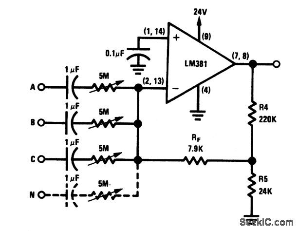 In many audio applications,it is desirable to provide a mixer tocombine or select several inputs,Such applications include public-address systems,where more than one microphone is used,tape recorders,hi-fi phonographs,guitar amplifiers,etc.This circuit provides for mlxlng of 600-Ω dynamic microphones, each with an output level of 10 mV The circuit operates from a 24-V Supply and delivers 5-V output,with a dynamic range of 80 dB.