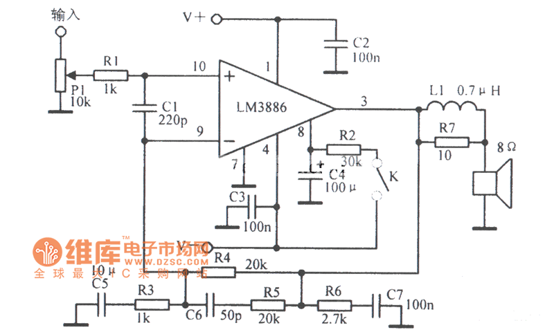 Published:2014/2/6 20:55:00 Author: | Keyword: Audio power amplifier LM3886 basic application circuit diagram, | From:SeekIC