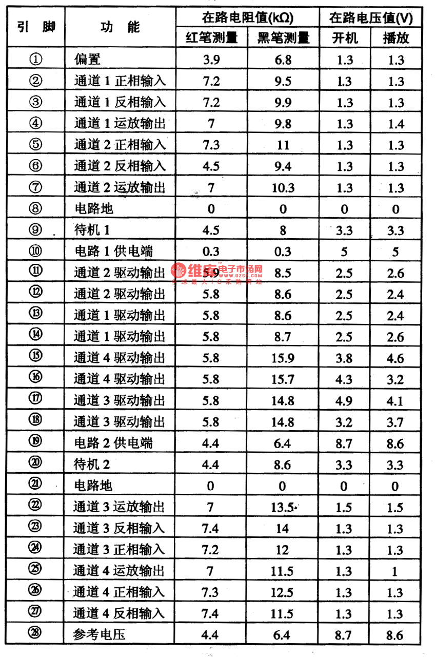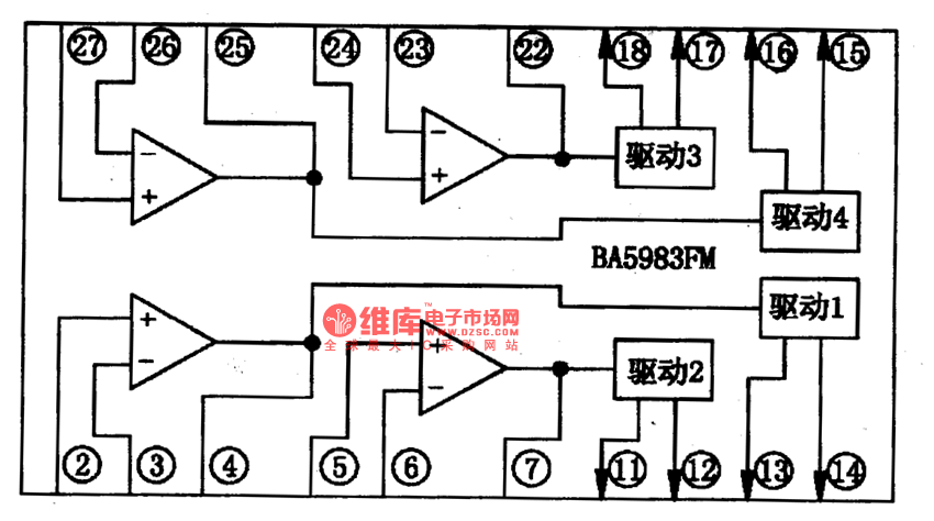BA5983F-E2 is an integrated 4-channel servo-driven circuit, which can convert servo control signals into drive voltage to drive the executing parts of DVD player servomechanisms.The internal circuit of BA5983FM一E2 is as shown in Figure 1, which is in 28-lead flat package with cooling fins. The pin functions and data are listed in Table 1.