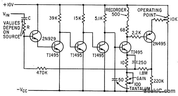 Feedback from final stage to input sets bias level of direct-coupled ac amplifier having current-derived stabilization, for driving re carder over range of 0.2 to 5 cps, with no bulky capacitors.-P. Laakmann, Direct Coupling Shrinks Amplifier Size and Cost, Electronics, 36:12, p 66-68.