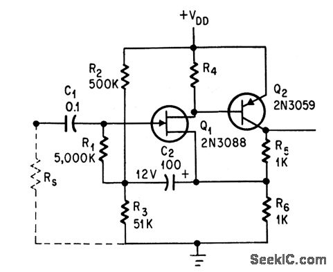 Input impedance is high at low frequencies (180 meg at 10 cps), butdrops to 3 meg at 10 kc. High collector current contributes to high over-all noiselevel.-B. Smith, Low. Noise FETs Sound Good To Circuit Designers, Electronics, 37:31,p 58-62.