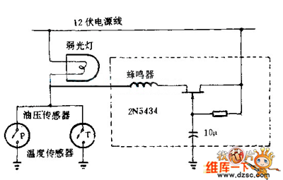 You can not judge if the engine monitoring indicator is turned on in day time, so you can use the buzzer circuit to compensate this shortage. Every time you start the engine, JFET 2N5434 will be conducted at 7 seconds delay time, so in the process of start the car and increase the hydraulic, the buzzer will not ring; at this time the indicator light monitors the oil pressure sensor and the engine temperature sensor. The whole circuit can beinstalled in the abandoned buzzer plastic shell of the bridge.