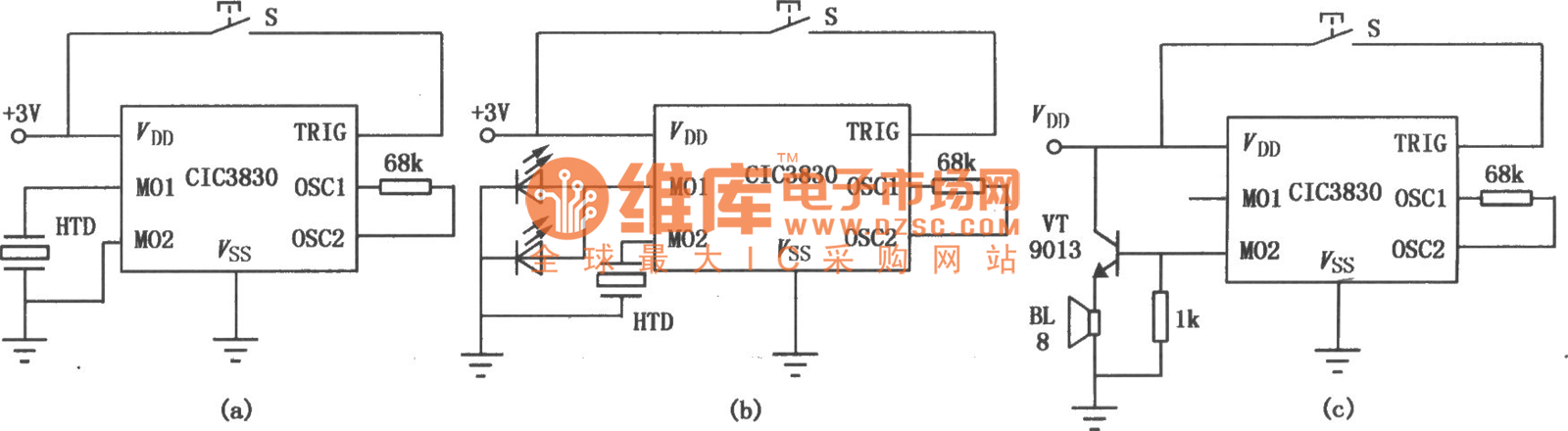 CIC38 series music integrated circuit can directly drive the piezoelectric ceramics buzzer, as shown in figure (a). When the power supply voltage VDD is 3V, it can promote the piezoelectric ceramic buzzer and the light-emitting diodes at the same time, the application circuit is as shown in figure (b). If you want to get a larger volume, you can connect an amplifier transistor V T1 (9013 or 8050) externally to drive the horn, the specific circuit is as shown in figure(c).