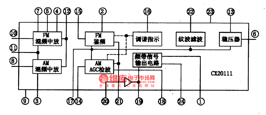 CX2O111 is the AM/FM radio integrated circuit produced by Sony, which is used in radios, recorders, compound stereos and so on.1.the internal circuit and pin functions of CX2O111CX2O111 includes all the circuits of the AM/FM and efficiency, mix, INTREQ and detected wave output audio signals. This IC is in 24-pin dual line flat package, whose internal circuit is shown in Figure 1 and the pin functions and data are listed in table 1.