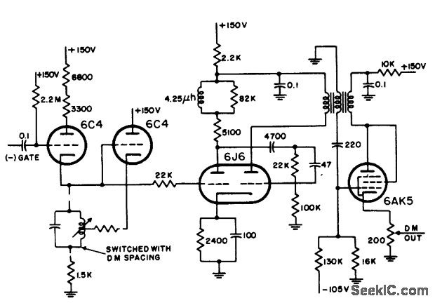 Uses switched Hartley oscillator, mvbr-type trigger shaper, and parallel-triggered blocking oscillator to generate distance marks for 2, 5, and 25 miles in airborne search radar. RLC unit is switched to change mark spacing.-NBS, Handbook Preferred Circuits Navy Aeronautical Electronic Equipment, Vol, 1, Electron Tube Circuits, 1963, p N8-2.