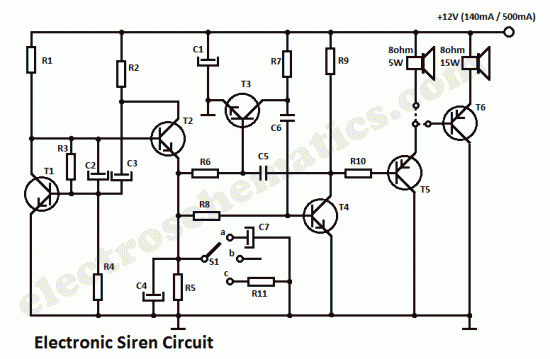 The DIY Electronic Siren circuit described here can create three different US-style siren sounds: DIY police, DIY ambulance and fire engine. The desired sound can be selected using switch S1. The circuit can be used in toys (such as model vehicles), as part of an alarm system, and in many other applications. For use in a toy, a BC337 is an adequate device for driver T5, since it is capable of directly driving a 200mW (8?) loudspeaker. In this case the current consumption from a 9 V power supply is around 140 mA. If a louder sound is required, a BD136 is recommended: this can drive a 5W (8?) loudspeaker. This will be the sound produced with the switch S1 on this positions: