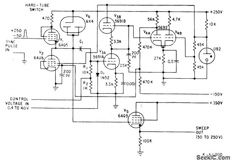 Maximum variation in sweep length is less than 1 part in 1,000. Uses modified Miller feedback circuit. Sweep role can be controlled over 10:1 ratio.-E. W. Van Winkle, High-Precision Sweep Generator, Electronics, 33:50, p 88-90.