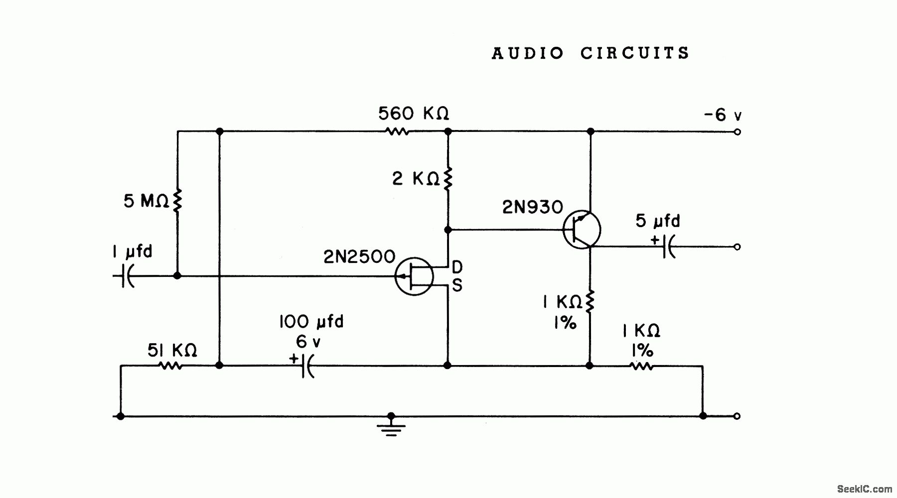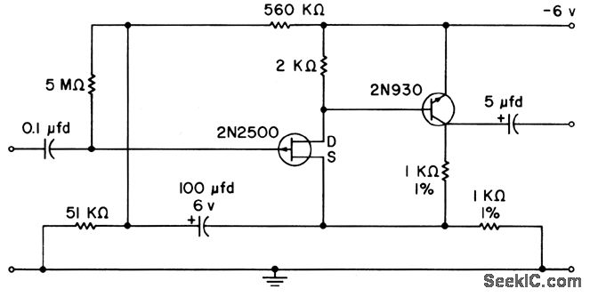 P-channel fet is combined with pnp transistor in equivalent to Darlington connection, for use with high-input-impedance low-frequency transducers.Spot noise figure is 7 db at 10 cps and 3 db at 100 cps. Broadband noise figure from10 cps to 10 kc is 1.7 db with 200K generator resistance.-Texas Instruments Inc., Solid-State Communications, McGraw-Hill, N.Y., 1966, p 136.