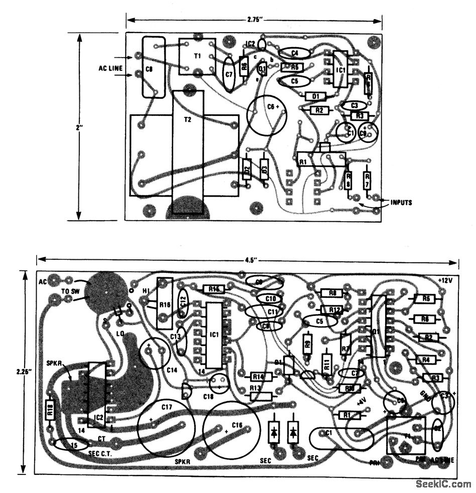 This complete carrier system is suitable for(high-qualit transmission of speech or music, and will operate from any ac outlet anywhere on a one-acre homesite. The frequency response is 20 to 20,000 Hz and THD_is under 0.5% for speech and music program material. The transmitter (Fig. 2-62A and 2-62C) is plugged into the ac line at a radio or stereo-system source The signal for the transmitter is ideally taken from the Monitor or Tape out connectors provided on component-system hi-fi receivers. The receiver (Fig 2-62B and 2:62B) amplifier ,limits, and demodulates the received FM signal in the presence of line-transient interference (sometimes as high as several hundred volts peak). The receiver also provides audio-mute in the absence of a carrier and 2.5-W audio output to a speaker. Transmitter carrier frequency fc is fixed near 100 or 200 kHz by C4/C7.The exact frequency is not important because T1 for both transmitter and receiver are tuned for maximum coupling to and from the ac line. Of course, both receiver and transmitter must be at the same frequency. With both transmitter and receiver operating (modulation is not necessary), tune the transmitter T1 for maximum, as measured with an ac VTVM at the receiver T1 secondary. Then tune the receiver T1 for maximum. Repeat as necessary. Set the receiver PLL free-running frequency with R16 near the center of its range. Rotate slowly in either direction until the PLL loses lock (as shown by a sharp increase in noise and a distorted output). Note the position of R16, and then repeat, rotating in the other direction. Note the new position, then center R16 between the two noted positions (a fine adjustment can be made for minimum noise if there is an SCR dimmer used in the house). Connect an audio signal to the transmitter input, and adjust RI for a maximum signal of about 0.1 V rms at pin 5 of IC1. This completes the adjustment. However, it might be necessary to readjust the receiver T1 slightly to minimize noise from SCR dimmers.