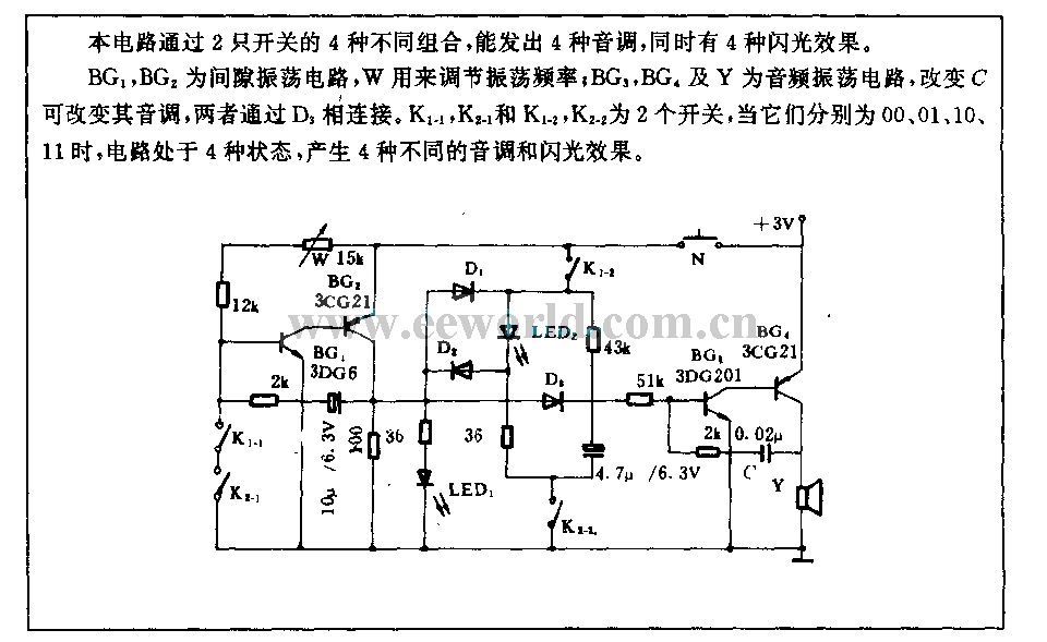 BG1, BG2 are gap oscillation circuit, W is used to adjust oscillation frequency; BG3, BG4 and Y are audio oscillation circuit, if C changes, the tone can be changed, they are connected by D3. K1-1, K2-1 and K1-2, K2-2 are two switches, when they are 00, 01, 10, 11, the circuit is in four states, and it will produce 4 kinds of tone and flashing effects.