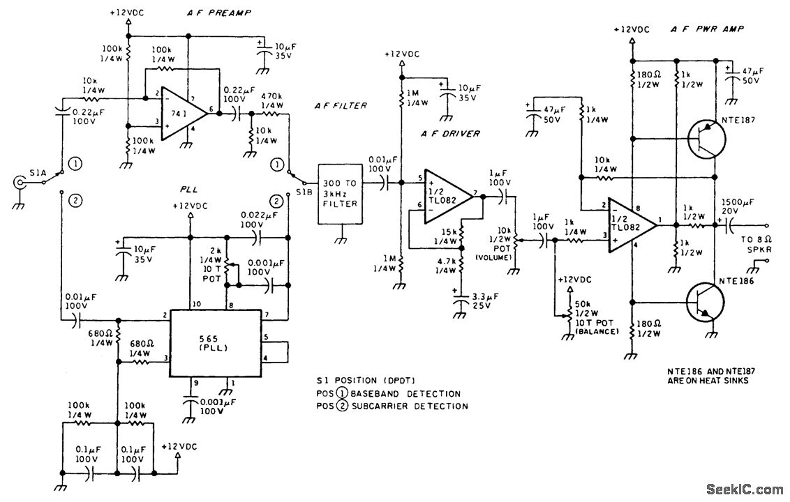 Video preamplifier output can be switched between an audio amplifier that establishes the correct level of the demodulated baseband audio when used for short distance test links and a phase-locked loop (PLL) that demodulates an FM subcarrier when used for longer distances. The PLL VCO is set to a 100-kHz subcarrier frequency. The error signal generated as the VCO tracks the FM signal produces the demodulated audio. Either of these outputs is sent to a 300- to 3000-Hz bandpass filter and on to an audio power amplifier capable of driving a low-impedance speaker or headphones. The dc power supply for these circuits is provided by a filtered 12 Vdc input.