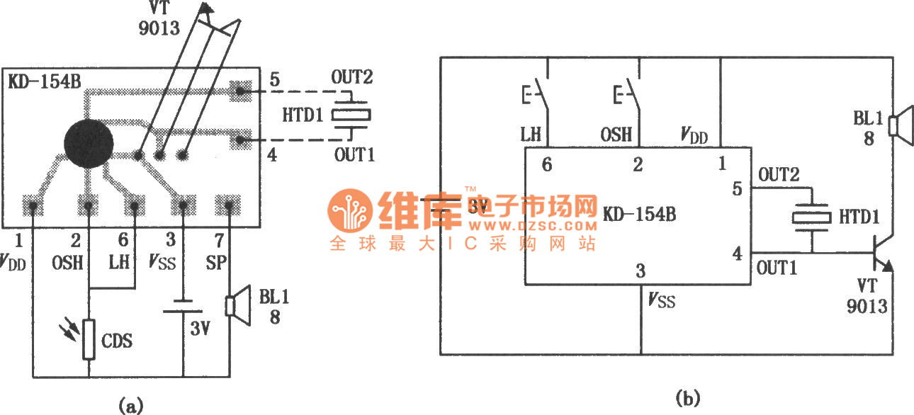 KD-1548 is a large-scale integrated circuit. It can realize the function of light control through connecting photo-resistor (CDS) externally; it can also work as an ordinary music integrated circuit. So it is widely used in electric reminders, alarm devices, electric toys, crafts, etc.The typical application circuit of KD 1548 as light control trigger is as shown in the figure(a) ; While figure(b) shows the situation when it is used as a common music integrated circuit. At this moment, if pressing the button OSH only, the circuit will be triggered and it will automatically stop when a song is finished. If pressing LH, the music will start, but it will stop once you loosen LH.