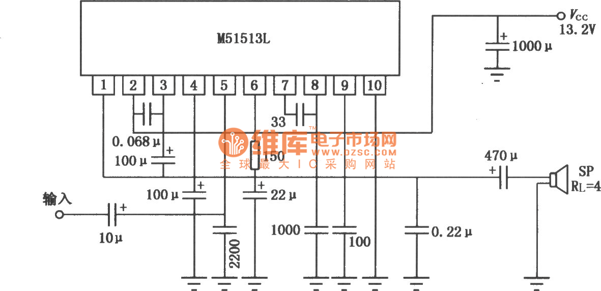M51513L is theaudio power amplifier IC. It uses 10-pin single in-line plastic package. The features of the two ICs are high voltage gain, large output power and they even work in 2Ω load. The power supply voltage is 9~16V. The output power is 5.8W(Typical), when the power supply voltage is 13.2V, load impedance is 4Ω and distortion is 10%. There are short-circuit protection, thermal cut off, power surge voltage protection etc. in the circuit. It is suitable for the audio power amplifier of car radio, car stereo installation. The typical application circuit of M51513L is shown as below.