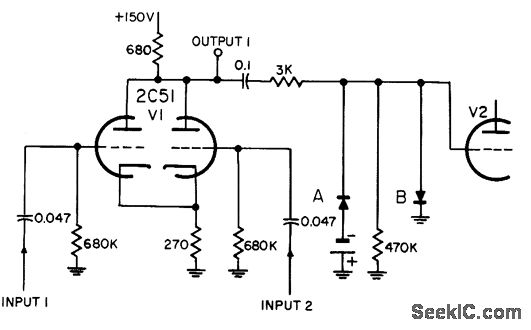 Common-plate mixer uses diode-limiting coupling circuit to nullify adding feature. Bias voltage on diode sets limiting level-NBS, Handbook Preferred Circuits Navy Aeronautical Electronic Equipment, Vol. 1, Electron Tube Circuits, 1963, p N4-8.