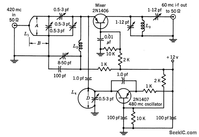 Common-base mixer is used with 480-Mc oscillator to give 60-Mc i-f output, with 10 db average conversion gain.-Texas Instruments Inc. Tran-sistor Circuit Design, McGraw-Hill, N.Y. 1963, p327.
