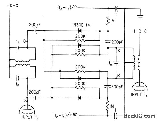 Used to lock crystal oscillator frequency to standard-frequency signals from WWV. Circuit mixes dock and WWV frequencies (fed to tubes at left and right) in Nygaard discriminator ar rangement, which delivers two outputs, each equal to difference frequency but differing 90°in phase. These output signals are amplified for synchronous motor that drives trimmer capacitor of crystal oscillator in servo loop that brings difference frequency to zero.-K.Nygaard, Atomic Clock Accuracy for Crystal Oscillators, Electronics, 33:46, p82-83.