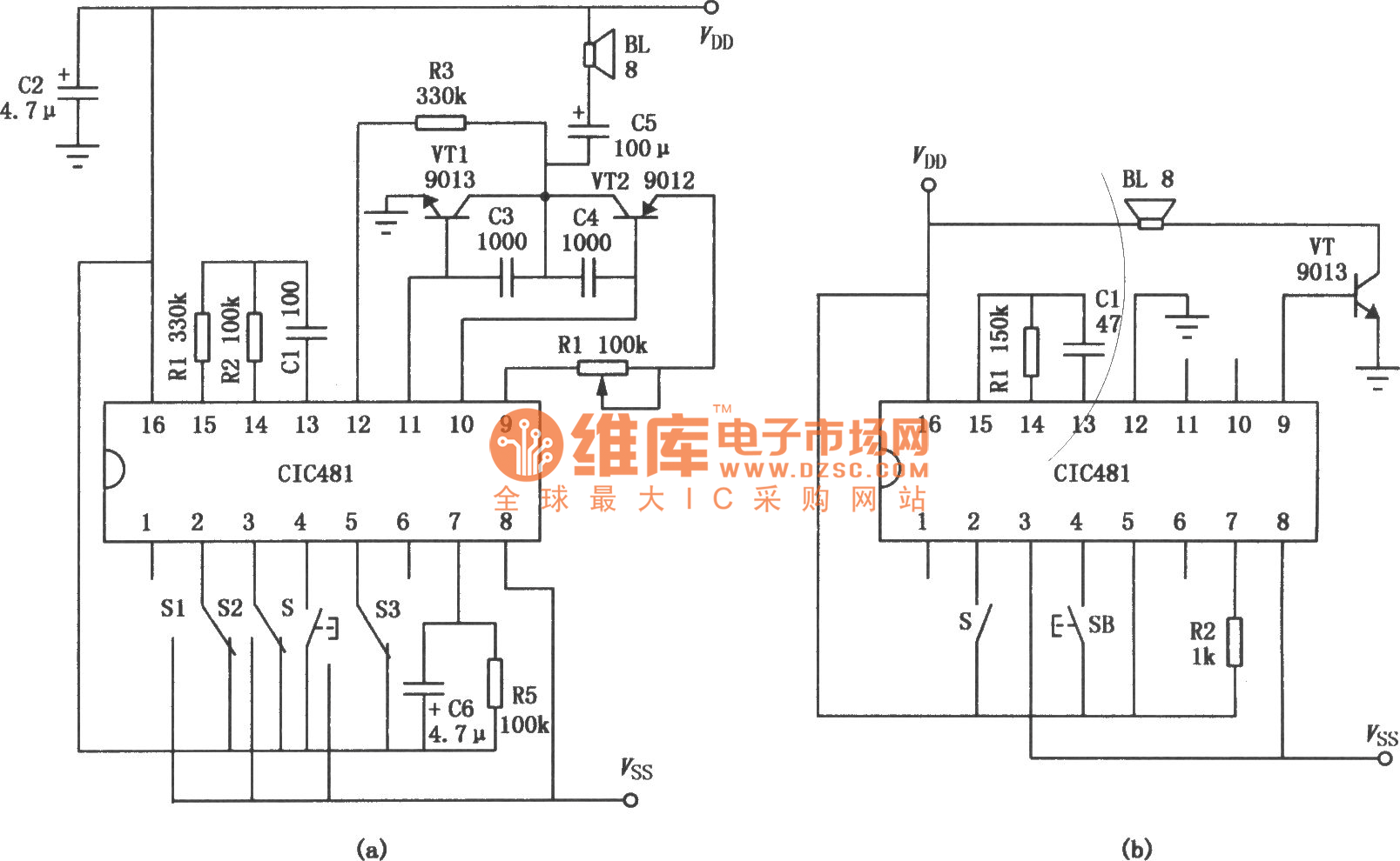 CIC481 is a CMOS music integrated circuit with songs played by piano, organ and mandolin. It can be used in products like toys, clocks, doorbells, etc. Its typical application circuit is as shown in the figure.